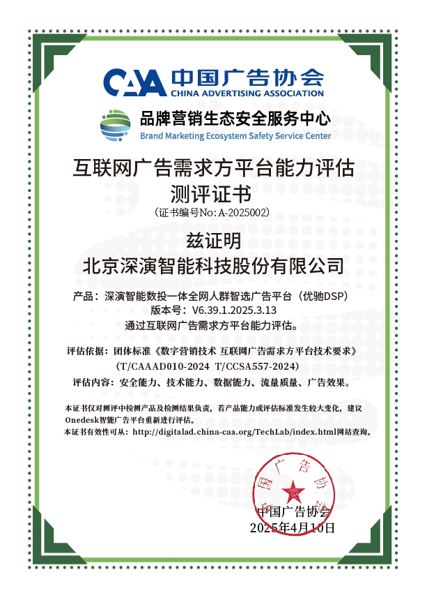 4月10日,中国广告协会发布「互联网广告需求方平台能力评估」测评结果。Martech领域领军企业球盟会qmh智能旗下产品球盟会qmh智能数投一体全网人群智选广告平台(优驰 DSP),凭借其在智能算法优化、技术创新、数据安全治理及流量质量管控等维度的突出表现,高分通过该项行业权威测评,获颁中国广告协会评估证书,成为业内首批通过认证的标杆企业。